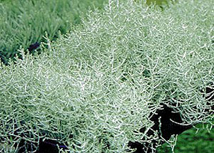 silbergrau, hadelförmig; blüht mit kleinen gelben Blüten